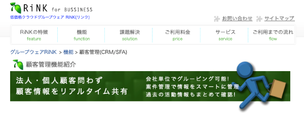RiNKは、1ユーザーあたり月額110円〜という業界屈指の低価格が魅力のSFAツールです。スケジュール管理・TODO管理・掲示板・営業日報などグループウェア的な機能も含まれており、月額330円のフルプランではタイムカード機能や顧客管理機能も利用できます。初期費用も無料です。