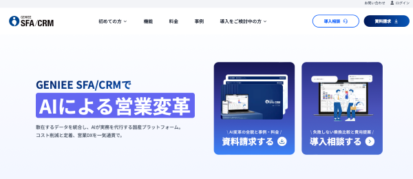 GENIEE SFA/CRMは、株式会社ジーニーが提供する国産営業管理ツールです。月額37,950円〜で、商談管理・顧客管理・レポート作成など営業に必要な機能が揃っています。導入コストの低さが評価されており、6,300社以上の導入実績があります。
